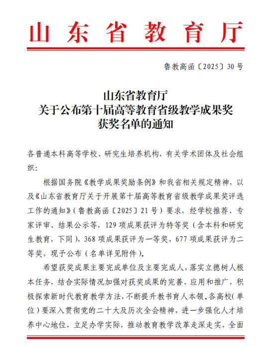 近日,山东省教育厅发布《关于公布第十届高等教育省级教学成果奖获奖名单的通知》(鲁教高函〔2025〕30号),我校共获评7项本科教学成果奖。其中,我校作为第一完成单位获二等奖4项,作为共同完成单位获一等奖2项、二等奖1项。