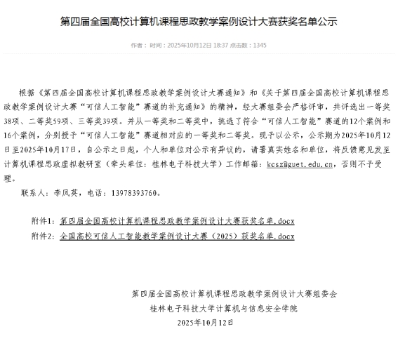 近日,第四届全国高校计算机课程思政教学案例设计大赛在桂林圆满落幕,我校参赛教师荣获二等奖1项、三等奖5项的优异成绩。