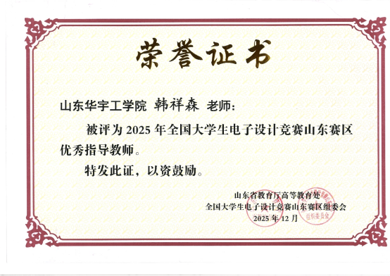 近日,2026年TI杯全国大学生电子设计竞赛山东赛区师资培训暨2025年山东赛区颁奖典礼在济南召开,我校荣获2025年度优秀组织奖,韩祥森老师获2025年度优秀指导教师。